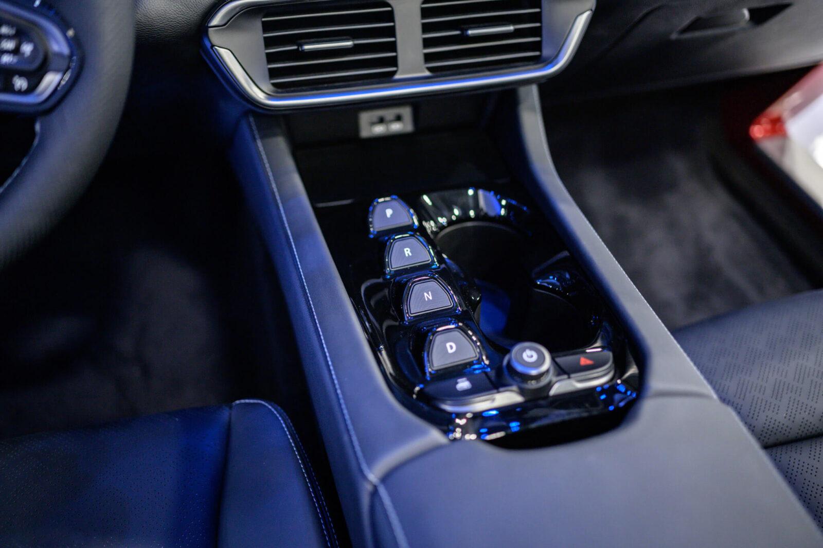 Cần số dạng nút bấm. Bệ tỳ tay kích thước lớn có thể trở thành bàn làm việc khi cần. Hệ thống đèn viền nội thất không chỉ mang đến cảm giác dễ chịu cho người ngồi, mà còn tăng thêm tính sang trọng cho mẫu xe điện nguồn gốc Việt Nam.